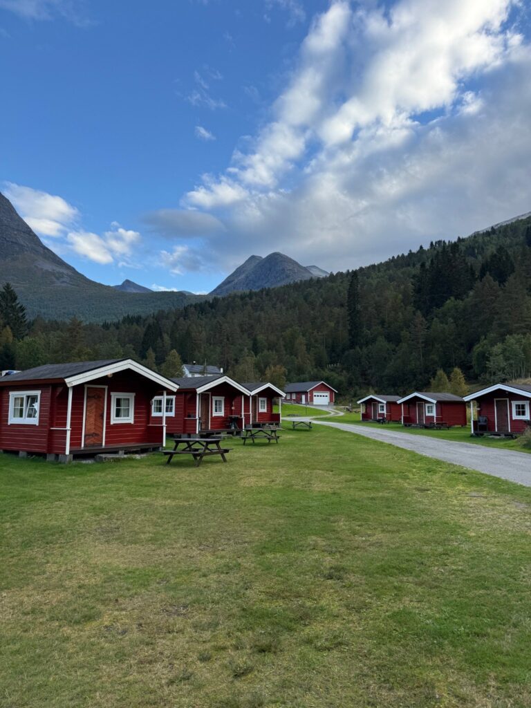 Die Hütten stehen auf Campingplätzen mitten in der Natur und haben genau das, was man nach einem langen Tag unterwegs braucht: ein warmes, schlichtes, praktisches Interior, feste Betten und einen trockenen Rückzugsort, falls Norwegen wieder „typisch Norwegen“ macht (Wind, Regen, beides gleichzeitig).